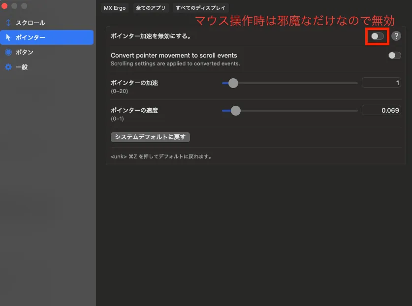 ここは完全にお好みだが、加速度がついているとWindowsとの使用感の違いを感じたので、私はOFFにしています。