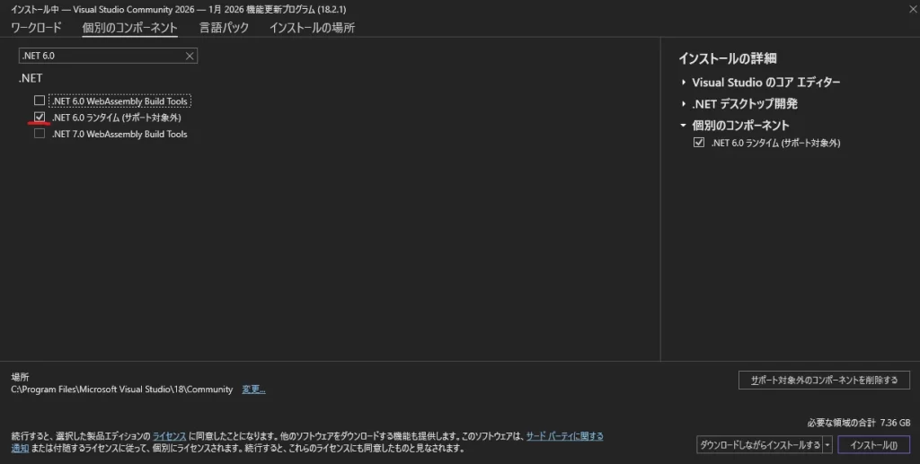 - ※ リストの中に「.NET 6.0」が見当たらない場合や、すでにチェックが入っている場合は、右側の「インストールの詳細」パネルの中に「.NET 6.0 ランタイム」が含まれているか確認できればOKです。