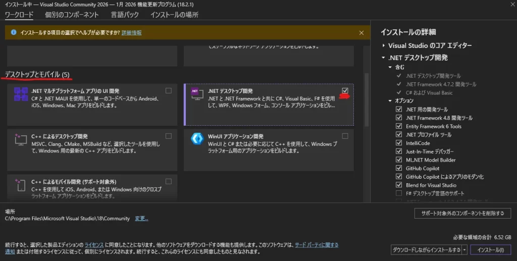 - 「ワークロード」タブで「.NET デスクトップ開発」にチェックを入れます(ここは同じ)。