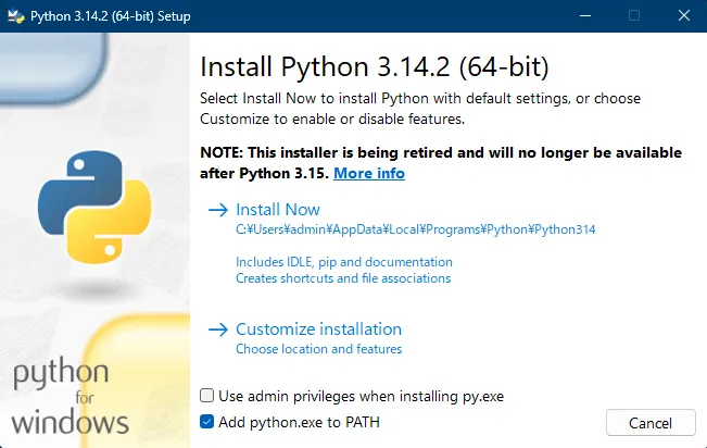 (例の画像は3.14.2ですが、最新すぎるとAIのライブラリ側が対応していないことが多いため、README記載のバージョンを入れることをお勧めします。) - インストールの最初の画面で、必ず「Add Python to PATH(環境変数に追加)」にチェックを入れてください。